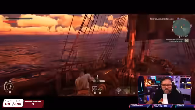 02:25:07Im weiteren Spielverlauf gerät der Streamer in Kämpfe mit Piraten, bei denen sein Schiff beschädigt wird. Er versucht, sich zu verteidigen, verliert aber letztlich sein Schiff und viele Ressourcen. Er unterhält sich während der Kämpfe über die Gefahren der Meere und muss sein Inventar verwalten, um Platz für wichtige Gegenstände zu schaffen. Nach dem Verlust des Schiffes beschließt er, es an einer Werft zu reparieren und nimmt neue Missionen an, wie die Eroberung einer Briganter Wagen.