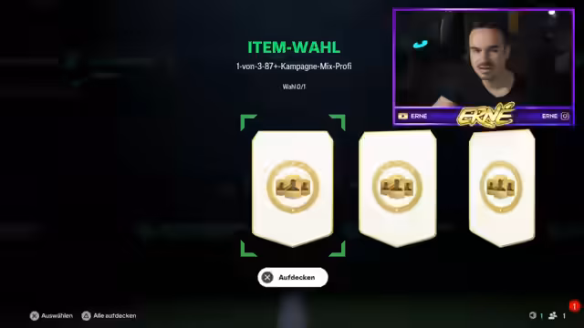 00:23:29Die angekündigten Pack-Opening-Session beginnt mit drei Packs der 83x14-Serie. Ernesto zieht fast ausschließlich Informs und Duplikate, was ihn frustriert. Der Chat schlägt daraufhin vor, Duplikate für die Erstellung der Squad-Building-Challenge (SBC) zu nutzen. Es wird eine spontane Wette gestartet, wie viele Fantasy-Karten man in einer SBC mit 84er Spielern ziehen wird. Die Wette endet unentschieden mit 0 gezogenen Karten. Nach den mäßigen Pack-Ergebnissen öffnet Ernesto die Kampagne-Pick-Box, bei der er jedoch keine nennenswerten Spieler erhält.
