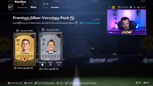 00:10:35Nach kurzer Diskussion mit dem Chat über die aktuellen FIFA-Preise werden seltene Gold-Packs geöffnet. Streamer wettet, ob ein Walkout-Spieler gezogen wird. Das Öffnen der Packs führt jedoch nur zu untradebaren und nicht erstklassigen Spielern, was Frustration auslöst. Die EA-Werbung läuft nun alle halbe Stunde statt alle 20 Minuten. Die Eröffnung weiterer Pack bringt keine grossen Erfolge, was Streamer als "scheiße" bezeichnet und den Markt als instabil beschreibt.