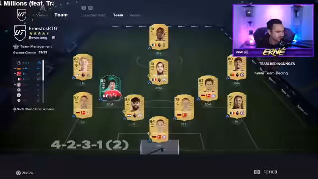 01:58:12Der Streamer beginnt mit dem Ultimate-Team-Modus auf einem RTG-Account, ohne echtes Geld zu investieren. Das Ziel ist es, 60 Sterne zu erspielen, um ein 50k-Pack zu erhalten. Nachdem das Team durchgespielt ist, wird ein Pack geöffnet, der Spieler wie Gordon und Mikkel Merino enthält. Anschließend wird das Team auf Basis der gezogenen Spieler neu aufgebaut und optimiert, um Chemie und Gesamtbewertung zu verbessern, ohne die Spieler sofort zu verkaufen.