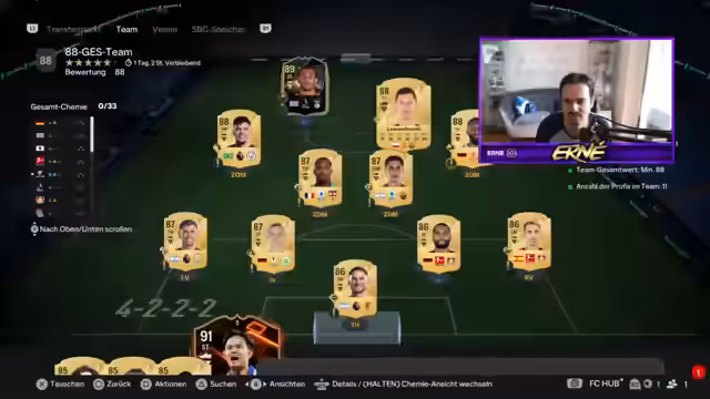 01:16:14Diskussionen über Spielergebnisse und Frustration über wiederholte Spieler in Packs. Es wird der Unsterblichkeitscup angekündigt, bei dem man durch 25 Siege Maldini und andere Belohnungen wie Icon Picks und Hero Picks erhalten kann. Dies wird als lohnender als die Weekend League angesehen. Es wird ein 92er Team präsentiert, und es wird überlegt, ob das Team zu hoch bewertet ist für den Cup. Es folgen intensive Anpassungen des Teams, um die Anforderungen für den Cup zu erfüllen. Spieler werden ausgetauscht, um das Teamrating zu senken, wobei auf Chemie und individuelle Spielerwerte geachtet wird. Verschiedene Spieler werden in Erwägung gezogen und wieder verworfen, um das optimale Team für den Wettbewerb zusammenzustellen. Es werden Goldvarianten von Spielern in Betracht gezogen, um das Gesamtrating zu senken. Das Ziel ist es, ein ausgewogenes Team zu erstellen, das den Anforderungen des Cups entspricht. Der Streamer experimentiert mit verschiedenen Aufstellungen und Formationen, um das bestmögliche Ergebnis zu erzielen. Es wird überlegt, ob bestimmte Spieler, wie z.B. ein Torwart, ausgetauscht werden sollen, um das Teamrating zu optimieren.