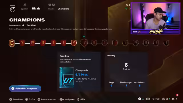 00:50:53Nachdem Ernesto mit 5:0 gestartet ist, beginnt er das erste Spiel der Weekend League. Der Gegner, Popsmoke, ist ihm sofort überlegen und führt schnell mit 0:2. Trotz defensiven Fehlern von Ernesto, insbesondere durch seine Mannschaft, holt er auf und führt zur Halbzeit mit 4:2. Der Gegner erzielt nach der Pause schnell das 3:4, doch Ernesto kontert und geht mit 5:3 in Führung.