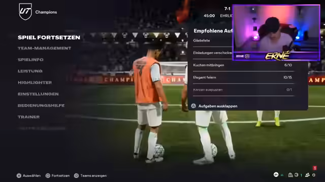 02:34:00Nach einer emotionalen Phase konzentriert sich der Streamer wieder auf die FIFA-Spiele. Er steuert auf eine vorgegebene Anzahl an Siegen zu und gibt an, mit 12 Siegen zufrieden zu sein. In einem Spiel gegen einen bekannten Gegner, 'Mirza', zeigt er sich nervös und spielt nach eigener Aussage unter Druck schlechter. Trotzdem gewinnt er das Spiel und bleibt auf Kurs, nur zwei Siege vom Ziel entfernt. Er bewundert die Taktik des Gegners, erkennt aber auch seine eigenen defensiven Schwächen an.