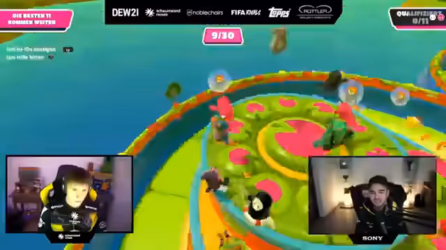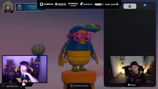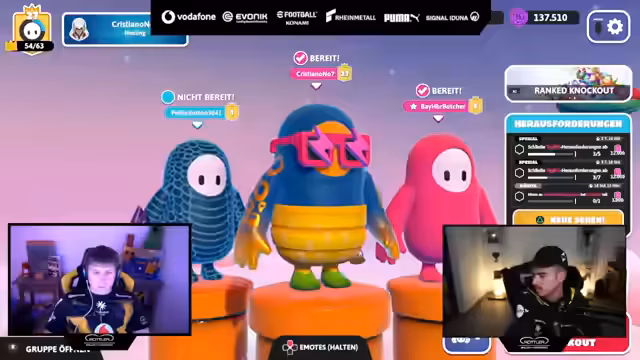 01:01:45Nach einem intensiven Rocket League-Spiel wechselt der Stream zu Fall Guys, um die Abwechslung zu wahren. Jedoch stößt der Wechsel auf technische Schwierigkeiten. Es gelingt nicht, eine stabile Lobby für ein klassisches Fall Guys-Spiel zu erstellen. Stattdessen landen die Spieler in ungewöhnlichen Modi wie 'Royal Fumble' und einem Blasen-Sammel-Modus, was für Verwirrung und Frustration sorgt. Der Fokus verlagert sich von dem eigentlichen Spiel hin zur Behebung von Einladungs- und Verbindungsschwierigkeiten auf der Epic Games-Plattform.