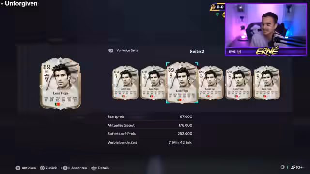 04:32:33Nachdem die Weekend League beendet ist, öffnet der Streamer die Belohnungen. Er stand am Ende bei 11 Siegen und zeigt die erhaltenen Packs. Es handelt sich hauptsächlich um Items von der Woche und ein Yoga-Bonito Garantie-Pack. Obwohl er anfangs enttäuscht ist, keine Walkout-Spieler zu ziehen, findet er im letzten Pack einen hochwertigen Icon-Spieler namens Abili, der als exzellenter Ersatz für den schwachen Pogba fungieren kann. Dieser Fund wendet die Stimmung und er ist sichtlich erleichtert und zufrieden mit dem Ergebnis der Belohnungen.