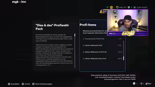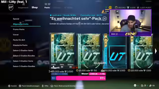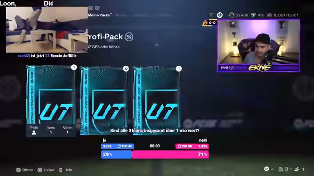 00:46:14Ernesto lädt Zuschauer ein, ihn für Icon-Pack-Öffnungen in deren Accounts einzuladen, und öffnet live Packs von Viewern (u.a. einen 87+ Icon-Pack mit Carlos Alberto). Er bestätigt seine Teilnahme am Monte-Weihnachtsevent am Sonntag, bei dem er ein 'krasses Geschenk' vorbereitet hat, und kündigt einen Döner-Test bei 'Holle' für Montag an. Zudem plant er einen Weekend-League-Stream am Folgetag und erwähnt seinen RTG-Account-Progress, wobei er Leihspieler kritisch hinterfragt.