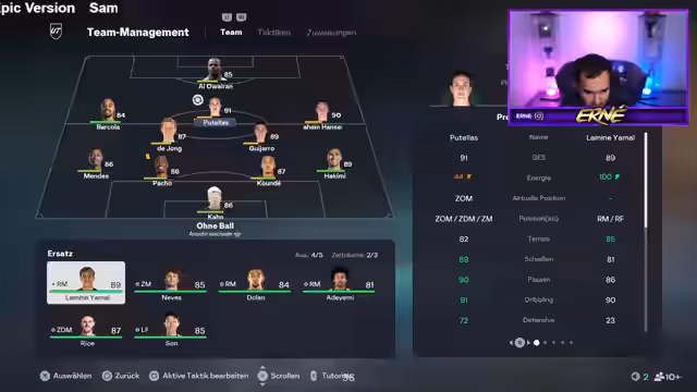 07:40:54Für das letzte Spiel des Ultimativen Duells muss ein völlig neues Team zusammengestellt werden, da Spieler nicht wiederholt werden dürfen. Dies gestaltet sich schwierig, da im Verein nur wenige passende Spieler vorhanden sind und die Chemie gering ist. Der Streamer experimentiert mit verschiedenen Ligen, um das bestmögliche Team für den Sieg und damit für die wertvollen Kudos-Belohnungen zu finden und zeigt den Prozess der Teamfindung auf.