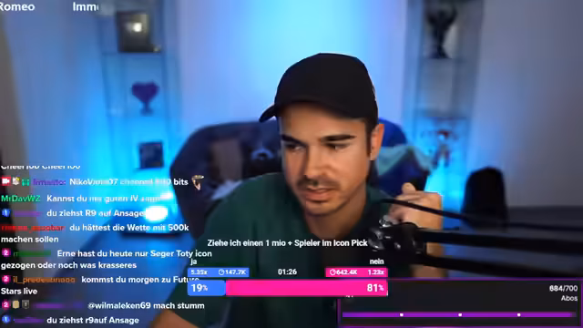 01:56:19Nach einigen weniger erfolgreichen Pack-Öffnungen engagiert sich die Community stark und spendet FIFA Points, um weitere Icon-Packs zu öffnen. Eine Wette wird ins Leben gerufen, bei der der Streamer darauf wetten möchte, einen TOTY-Spieler oder eine TOTY-Ikone zu ziehen. Die Zuschauer erhalten Mitspracherechte und entscheiden per Abstimmung über die nächsten Aktionen. Es herrscht eine dynamische und interaktive Stimmung, wobei die finanzielle Unterstützung der Community für die Fortsetzung des Streams entscheidend ist.