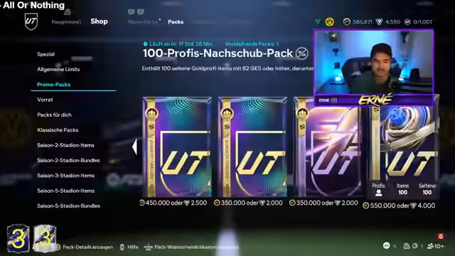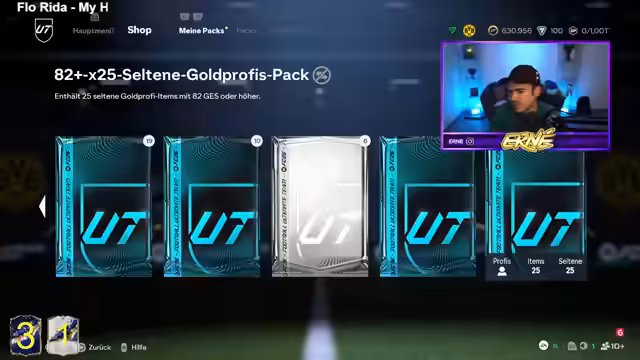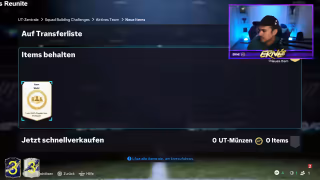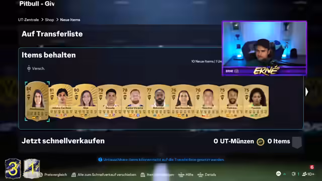 00:16:57Nach der Ankündigung einer Wette, innerhalb eines bestimmten Zeitfensters einen blauen Walkout zu ziehen, beginnt das eigentliche Pack Opening. Die ersten Versuche mit 3x85 Mittelfeldspieler- und 3x85 Verteidiger-Packs verlaufen erfolglos. Der Streamer öffnet daraufhin 10x82-er-Packs und hat im ersten dieser Packs sofort Erfolg, indem er den TOTY-Spieler Entler zieht. Nach einem kurzen Gespräch über die Pull-Rate und ein erfolgreiches Duplikat-Management werden weitere 82-er-Packs geöffnet, was zu einem weiteren TOTY-Spieler, Wendler, führt. Die anfängliche Euphorie wechselt jedoch zu Enttäuschung, als die folgenden Packs keine weiteren blauen Walkouts liefern.