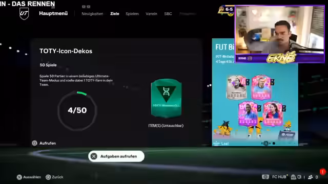 00:04:18Der Stream beginnt mit Begrüßungen des Streamers Ernesto und seiner Co-Moderatoren Ashwin und Albulena. Die Hauptziele für den Stream werden definiert: die Abschluss der Weekend League mit dem Ziel von 9 Siegen, das leveln des Battle Pass für das Icon-Pick und der Start des Ghost of Tsushima DLCs später am Abend. Streamer erwähnt, dass er nur drei Zeit hat und danach zur Icon League muss, was den Zeitdruck unterstreicht.