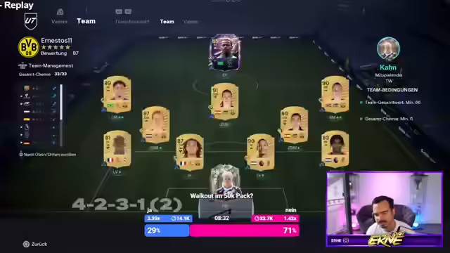 04:46:01Der Streamer öffnet Player Picks in der Hoffnung auf gute Spieler, ist aber enttäuscht von den Ergebnissen. Trotz eines Walkouts erweist sich der gezogene Spieler als nicht besonders wertvoll. Anschließend startet er einen Draft und initiiert eine neue Wette, wie weit er in diesem Draft kommen wird. Nach einer kurzen Pause, um sich nach dem Essen zu erkundigen, konzentriert sich der Streamer auf den Draft. Er wählt Van Dijk und anschließend Best ins Team. Später zieht er Johan Cruyff auf der 10. Position, was seine Freude deutlich steigert. Es folgen weitere Spielerwahlen, wobei er auf eine gute Chemie und die individuellen Fähigkeiten der Spieler achtet. Am Ende stellt er ein Team zusammen, mit dem er zufrieden ist und startet eine Wette über den Ausgang des Drafts.