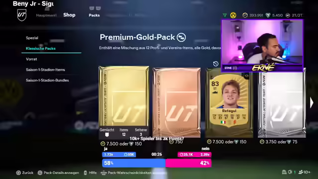 02:58:06Der Streamer feiert den Gewinn seines ersten Draft-Spiels und zeigt seine Erleichterung. Es werden die hohe Anzahl an Toren in den vorherigen Spielen erwähnt. Er hofft auf großzügige Belohnungen, wie ein 50k- oder 100k-Pack. Es folgt eine Enttäuschung über die erhaltenen Packs und deren Inhalt. Der Streamer startet eine Wette mit seinem Chat bezüglich der Anzahl von Walkouts in den folgenden Belohnungen. Nach einer Pinkelpause und kurzer Werbung kehrt der Streamer zurück und schaltet einen Ventilator ein, um sich abzukühlen. Es werden die Draft-Final-Siege-Packs geöffnet und die Ergebnisse sind enttäuschend. Der Streamer kritisiert die mangelnden Belohnungen und stellt fest, dass sich der Draft nicht gelohnt hat. Er überlegt, was er mit seinen verbleibenden Points machen soll und plant, diese für ein weiteres Draft zu nutzen. Es wird überlegt, ob man Puteas holen soll und welche Playstyles sie hat. Der Streamer entscheidet sich, die Packs zu öffnen und hofft auf gute Ergebnisse, um Puteas leisten zu können. Nach einigen Problemen mit dem Spiel und den Packs zieht der Streamer Totti. Er kauft Puteas für sein Team und stellt sein fertiges Team vor.