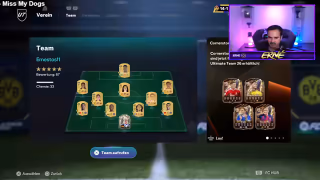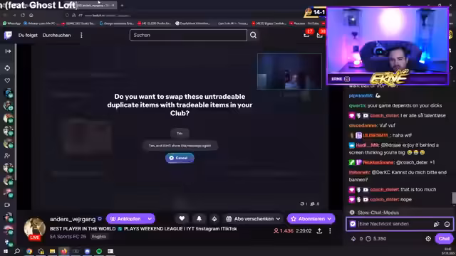 01:08:59Der Fokus liegt auf dem Gameplay in der Weekend League. Ernesto spielt mehrere Spiele, erreicht Siege und diskutiert den Teamvorteil seines hochwertigen FIFA-Teams. Eine Wette wird aufgestellt, ob er ein 10-0-Ranking erreichen kann. Trotz technischer Herausforderungen und Frustration über Animationen wird das Fortschreiten in der Weekend League betont. Die Interaktion mit dem Chat bleibt aktiv, und es werden strategische Entscheidungen während der Spiele besprochen, wie die Nutzung von Dumonray und die Zeitkontrolle. Dies rundet den Stream mit einem Fokus auf kompetitives Gaming ab.