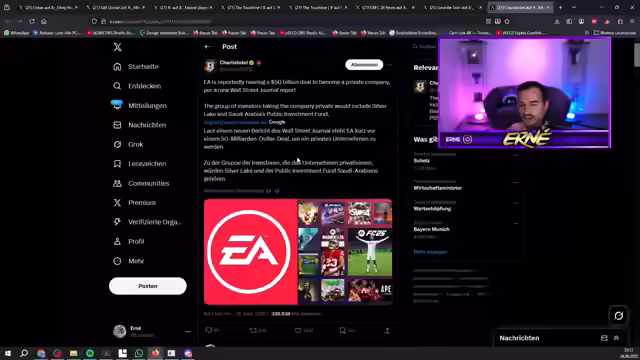 03:21:37Es wird über unglaubliches Glück beim Ziehen von Spielern in Vorschau-Packs diskutiert. Im Anschluss wird ein Rekord von Harry Kane thematisiert, der schneller als Ronaldo und Haaland 100 Tore für einen Verein erzielt hat. Daraufhin wird über einen möglichen 50-Milliarden-Dollar-Deal von Saudi-Arabien zur Privatisierung von EA spekuliert. Es wird erörtert, was passieren würde, wenn EA tatsächlich 50 Milliarden Dollar erhielte, inklusive der möglichen Auswirkungen auf kommende Packs und Spielerbewertungen. Der aktuelle Firmenwert von EA wird auf 40 bis 45 Milliarden Dollar geschätzt. Eine Übernahme durch Saudi-Arabien könnte strategische und unternehmerische Änderungen sowie Aufsehen in der Gaming-Branche verursachen.