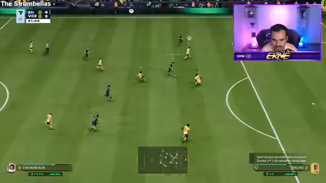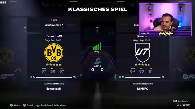 05:37:12Der Stream beginnt mit FIFA-Spielszenen, bei denen der Streamer gegen einen Gegner namens Schalke spielt. Es gibt Kommentare zum Gameplay und zur Leistung. Der Streamer ärgert sich über die Verbindungsprobleme, die ihm die Chancen verpassen lassen. Er erwähnt auch, dass er in Division 5 aufsteigen möchte, und seine Fans ermutigen ihn dabei.