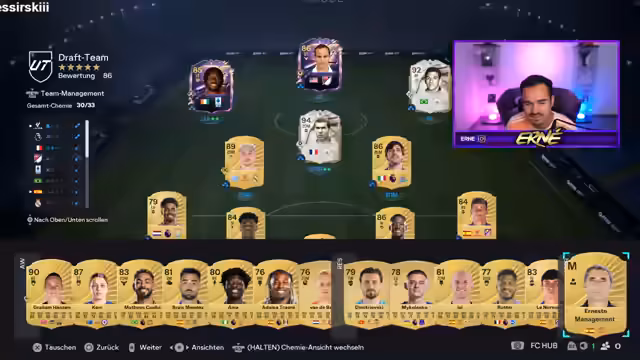 01:23:20Der Streamer verbringt viel Zeit mit FIFA-Drafts, verliert dabei aber auch eine beträchtliche Anzahl von Münzen. Er zeigt sich frustriert über die Performance seiner Spieler, besonders über Konaté und Onana. Gleichzeitig feiert er einige Erfolge, als er im Draft einen Walkout zieht und mehr Münzen gewinnt als investiert. Er ist von der Spielstimmung und der Qualität der Spieler begeistert, besonders von Hazard und Ronaldo, die er im Team hat.