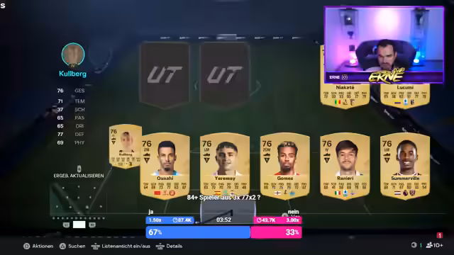 03:03:35Nachdem das Team mit Colomani verstärkt wurde, werden mögliche SBCs wie eine 83-Plus-Upgrade und ein 2x77-Plus-Upgrade diskutiert. Der Streamer entscheidet sich jedoch gegen die Ausführung, da der Aufwand im Verhältnis zum potenziellen Gewinn nicht zu stehen scheint. Anschließend wird die Follower-Basis nach der nächsten Aktion befragt: Entweder ins Gameplay wechseln oder einen kostspieligen Draft starten. Nach einer Abstimmung und der Erkenntnis, dass der Draft die Gewinne aus Rivals übertreffen könnte, wird riskant die Münzreserve für einen Draft investiert, was den Kurs für den Rest des Streams bestimmt.