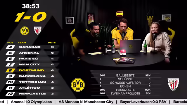 Die Watchparty BVB gegen Bilbao startet mit Aufstellungsanalyse und einem Bingo-Spiel. Diskussionen über Taktik, VAR-Entscheidungen und Halbzeitfazits prägen das Geschehen. Die Zuschauer tippen auf Ereignisse, um Preise zu gewinnen. Halbzeitstand: 1:0. In der zweiten Halbzeit wird das Bingo-Spiel fortgesetzt, während die Stimmung im Stadion steigt.