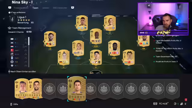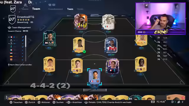 04:39:37Die Suche nach der optimalen Teamchemie erweist sich als kompliziert, da verschiedene Spieler und Trainer-Kombinationen diskutiert werden, um alle auf volle Chemie zu bringen. Koundé als RV wird als starke Option in Betracht gezogen, obwohl die Kosten eine Herausforderung darstellen. Der Streamer plant, Koundé als RV zu integrieren, Areola ins Tor zu stellen und die Evolutionen von Areola und Van der Veen abzuschließen. Trotz der noch fehlenden Münzen wird das Team als brutal geil und taktisch flexibel beschrieben, mit der Möglichkeit, Benzema als ZOM einzusetzen. Es wird angekündigt, weitere Drafts zu spielen, um die fehlenden Münzen zu verdienen und das Team zu vervollständigen, wobei die Abwehr mit Cordoba und Koundé als besonders stark hervorgehoben wird.