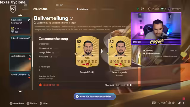05:12:39Nach erfolgreichen Spielen wird die Evolution von Kamavinga abgeschlossen, was seine Karte optisch und spielerisch aufwertet. Parallel dazu wird die Planung für die Evolution von Van de Ven detailliert besprochen. Es wird diskutiert, welche Evolution zuerst durchgeführt werden soll, um den bestmöglichen Playstyle „Abdrängen Plus“ zu erhalten. Nach anfänglicher Verwirrung und Diskussion mit dem Chat wird entschieden, eine bestimmte Evolution zuerst zu aktivieren, die 10.000 Münzen kostet, um sicherzustellen, dass Van de Ven später „Abdrängen Plus“ in Gold erhält und somit zu einem „Biest“ in der Innenverteidigung wird. Die Strategie zielt darauf ab, Van de Ven zu einem der besten Innenverteidiger im Spiel zu machen.