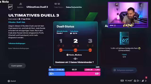 00:05:06Der Streamer plant, an einem Turnier teilzunehmen, bei dem man Karim Benzema erhalten kann. Er hat bereits drei Spiele absolviert und alle gewonnen. Allerdings scheint der Turnier-Modus verbuggt zu sein, da im Chat verschiedene Theorien über die optimale Vorgehensweise kursieren, um alle Belohnungen zu erhalten. Es wird diskutiert, ob man absichtlich verlieren und Tore schießen oder keine Tore schießen muss, um die Aufgaben zu erfüllen. Parallel dazu stehen wichtige Evolutionen an. Kamavinga soll bald fertiggestellt werden, und es gibt eine vielversprechende Evolution für den Innenverteidiger Van der Veen, die sein Rating auf 84 erhöht und ihm neue Playstyles verleiht. Diese Karte ist bereits im Wert gestiegen. Zudem ist geplant, die Pogba-SBC zu absolvieren und einige Packs zu öffnen, bevor später Rivals-Spiele und das Turnier in Angriff genommen werden.