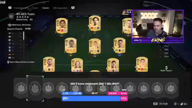 03:52:32Die abschließende Teambesprechung konzentrierte sich auf die Verlegung von Nesta ins zentrale Mittelfeld, um die Defensive zu stabilisieren. Darüber hinaus wurde die geplante Evolution von Bradley und Mandy auf 90er-Karten thematisiert, wobei die Kosten von 40.000 bzw. 70.000 Münzen kritisch hinterfragt wurden. In einer Abstimmung entschied sich der Streamer, die Evolution von Mandy vorerst auszusetzen, und diskutierte stattdessen den Einsatz des neu gezogenen Garincha. Ein weiteres Thema war der Versuch, den Envaneri mit einer besseren Evo auszustatten, was jedoch als nicht sinnvoll befunden wurde.
