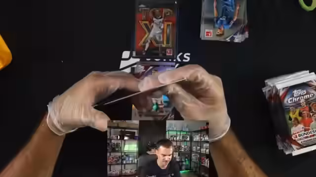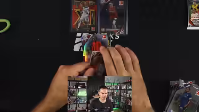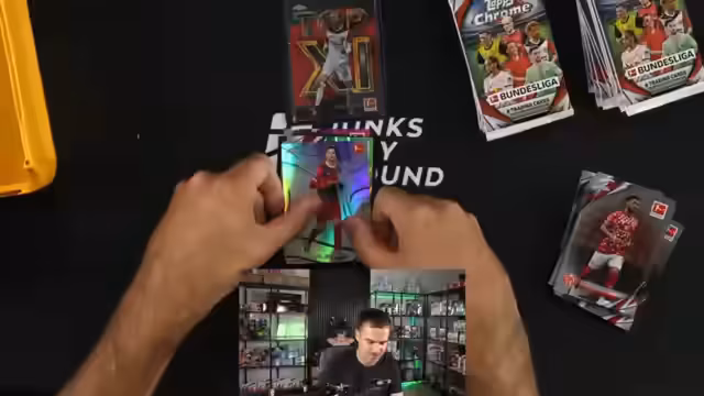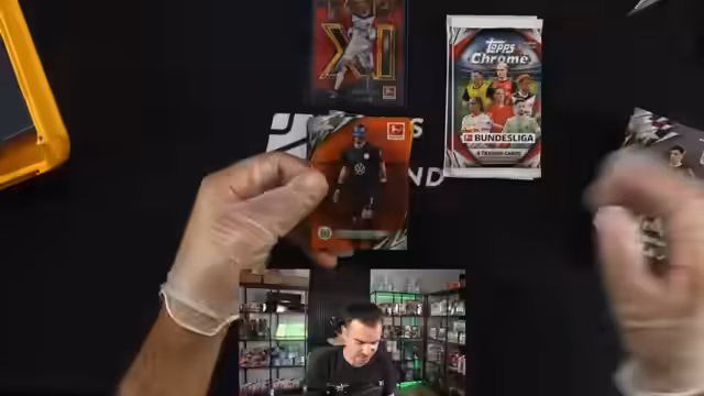 02:32:24Nachdem die Einzelbox-Auktionen abgeschlossen sind, geht es in den Hauptteil des Streams: den Case-Break. Es handelt sich um das Öffnen einer Topps Chrome Bundesliga Box. Der Streamer testet verschiedene Präsentationsmethoden und entscheidet sich dafür, die Karten Box für Box zu öffnen und nur die wichtigsten Hits, wie Nummernkarten und Autogramme, separat zu präsentieren. Eine erste Box liefert sofortige Highlights mit einer fachen Karte und einem Autogramm von Miron Boadu. Die Karten werden sorgfältig in Sleeves und Toploader verpackt, um die Erhaltung zu sichern.
