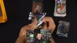 03:55:26Nachdem die ersten Hälften der Packs geöffnet wurden, beginnt der Streamer mit der Verarbeitung der Karten. Er präsentiert zunächst alle Hits und Insert Cards, bevor er sie anschließend in Sleeves steckt. Dabei bemerkt er, dass einige Karten sehr gut kleben und zeigt dies am Beispiel eines Grabara-Rainbow.