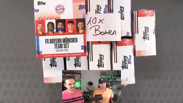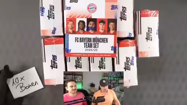 03:40:55Nach dem Abschluss des Half-Case-Breaks beginnt Ernesto damit, die gezogenen Karten zu Sleeven und in Top-Loadern zu verstauen. Gleichzeitig startet er ein weiteres Giveaway für eine Tops Gold Box im Wert von knapp 300 Euro. Er öffnet noch eine letzte einzelne Bayern-Box, bei der sich die Zuschauer in Sudden Death mit einem Euro die verbleibenden Spote sichern können. Die Live-Stream endet mit einer Verlosung der Gold Box und persönlichen Verabschiedung an die Zuschauer.