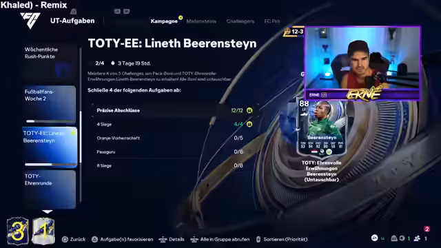 04:03:58Der Stream startet mit dem Öffnen von Packs und der Präsentation neuer Spielerkarten. Ernesto zeigt unter anderem einen Puder, den er für den Toty-Double-Workout benötigt. Er erwähnt auch die bevorstehende Reise in die Türkei und macht sich humoristisch über den Gegner Rotmann lustig, den er als Mörder bezeichnet. Der Fokus liegt auf der Vorstellung der geöffneten Karten und der Vorbereitung auf das anstehende Weekend-League-Spiel.