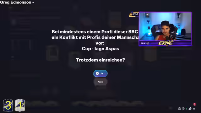 00:11:04Ein zentrales Thema des Streams ist der Versuch, die SBCs für Ronaldo abzuschließen. Ernesto stellt fest, dass er für die notwendigen SBCs noch viele 88er- und 89er-Spieler benötigt, jedoch aufgrund der vielen Duplikate im Verein Probleme hat, das benötigte Futter zu sammeln. Er ist frustriert, da er befürchtet, die SBC nicht zu schaffen und die Coins zu verschwenden, und diskutiert verschiedene Strategien, um die Spieler effizient einzusetzen und Duplikate zu verarbeiten.