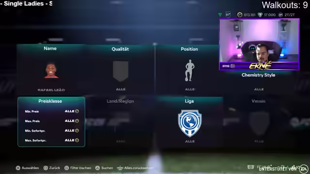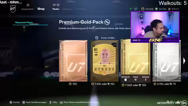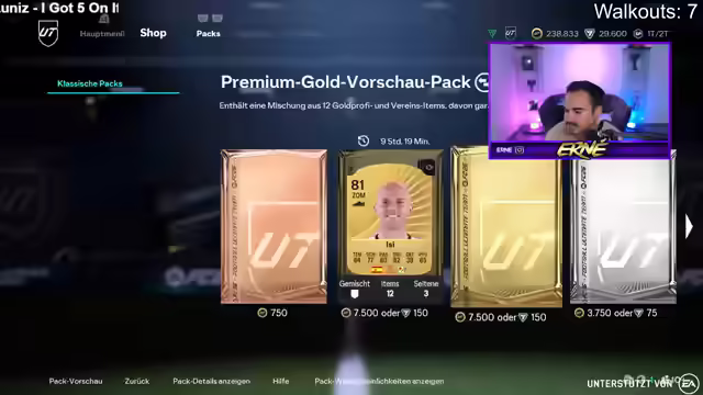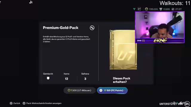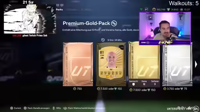 01:49:47Der Streamer kündigt eine neue Wette an: Bis 23k Points soll ein Spieler über 10k gezogen werden. Er zieht ein weiteres Walkout, aber es ist wieder eine Frau. Der Streamer scherzt darüber, dass er auf Frauenjagd im Spiel ist. Er zieht auch einen Inform, Oberdorf. Die Community diskutiert, ob der Streamer nach dem Vorschreiben Frauen-Workouts soll. Der Streamer überlegt, ob er Oberdorf für 100k reinstellen soll. Er bedankt sich für die Unterstützung und verabschiedet sich von den Zuschauern. Er kündigt an, dass er bald wieder live sein wird. Der Streamer zieht noch ein paar Packs, aber keinen Spieler, der die neue Wette erfüllt. Er beendet den Stream und bedankt sich bei allen, die dabei waren. Er freut sich darauf, die Zuschauer bald wiederzusehen.