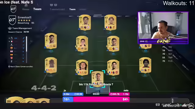 00:54:33Der Streamer erklärt, dass er nicht mehr so viel Geld in das Spiel investieren kann wie früher, da er jetzt Verantwortung hat. Plötzlich zieht er Mamouche, was für große Freude sorgt. Mamouche ist sogar extinct, was bedeutet, dass er sehr wertvoll ist. Die Wette, ob bis 33k Points ein Walkout gezogen wird, geht auf. Mamouche wird behalten, da er als sehr guter Spieler eingeschätzt wird. Kurz darauf zieht der Streamer auch noch Mandy. Die Community feiert das Erreichen des Sub-Ziels von 300 Subs. Der Streamer bedankt sich bei allen, die dazu beigetragen haben, und kündigt ein neues Ziel von 400 Subs an. Es wird überlegt, Rivals zu spielen und ein Team zu bauen. Der Streamer zieht weitere Spieler, aber noch keinen, der an Mamouche herankommt. Er kündigt eine neue Wette an und macht bis 27k Cup Points weiter. Es wird überlegt, ob man sich von den Münzen Benzema holen soll. Der Streamer zieht ein weiteres Walkout, aber es ist wieder eine Frau. Er zieht auch einen Inform, Oberdorf. Die Wette zählt und die Community diskutiert, ob der Streamer nach dem Vorschreiben Frauen-Workouts soll.
