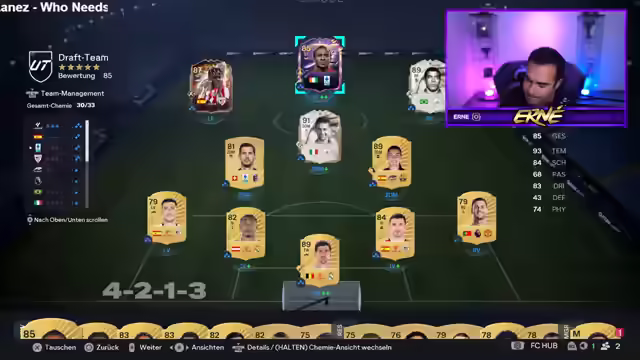 01:40:30Der Streamer plant einen Draft, um sein Glück zu versuchen und das Hero-Pack doch noch zu bekommen. Er bedankt sich bei Nils King für die Unterstützung. Es wird überlegt, ob ein Draft gemacht werden soll oder nicht. Der Streamer analysiert die Kosten für das zweite Set des SBCs und stellt fest, dass er nicht genügend Spieler hat, um es abzuschließen. Er entscheidet sich für einen Draft und wettet mit dem Chat, wie weit er kommen wird. Der Streamer wählt seine Formation und überlegt, welchen Spieler er als erstes auswählen soll. Er entscheidet sich für Baggio als ZOM. Es werden weitere Spieler ausgewählt, darunter Leao und Patri. Der Streamer wählt Spieler aus, die gut zusammenpassen und die Chemie verbessern. Er stellt fest, dass sein Main-Team nicht optimal aussieht und hofft auf Verstärkung durch die Bank.
