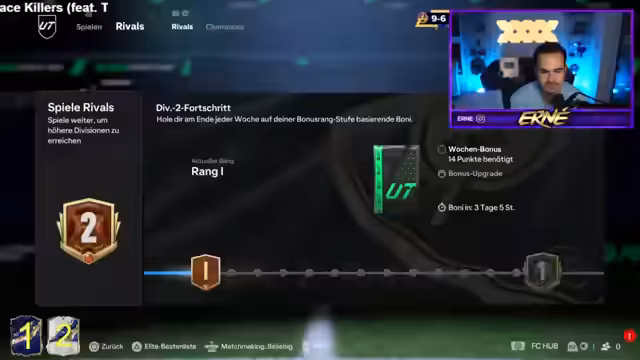 01:50:51Aufgrund der mangelhaften Ergebnisse auf dem Hauptaccount wechselt der Streamer zu seinem RTG-Account. Hier darf er nur mit gezogenen oder selbst erstellten Spielern spielen und keine Punkte verwenden. Das Team ist qualitativ hochwertiger als das des Main-Accounts. Der Streamer beginnt, Rivals-Spiele zu spielen, um aufzuwärmen und Belohnungen zu erhalten, insbesondere den 86er-Plus-Pick. Das Ziel ist es, sich für die Weekend League zu qualifizieren und die dortigen Belohnungen zu sichern.