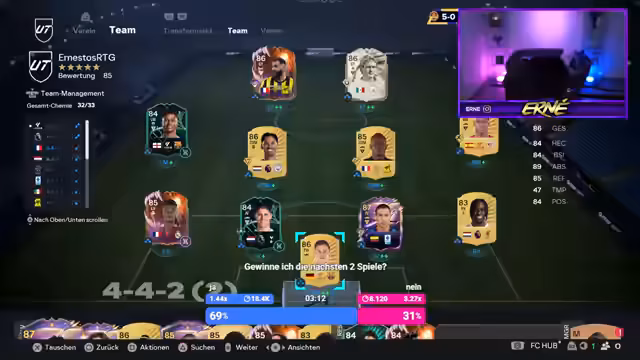 00:01:44Zu Beginn des Streams öffnet Ernesto verschiedene Pack-Types, darunter 83x2 Prime-Goldspieler, Jumbo-Premium-Gold und die Kampagne-Wundertüte. Dabei zieht er einige Spieler, die er jedoch direkt wieder auf den Transfermarkt bringt. Der Fokus liegt nicht auf den Pulls, sondern auf der Vorbereitung des Teams für die Weekend League. Er stellt sein aktuelles Team vor und erwähnt, dass er Kamavinga den Hunter-Upgrade verpassen möchte. Nach kurzer Unentschlossenheit entscheidet er sich, schnell nach den Upgrades Hunter und Shadow für einige Spieler zu suchen, um das Team zu optimieren.