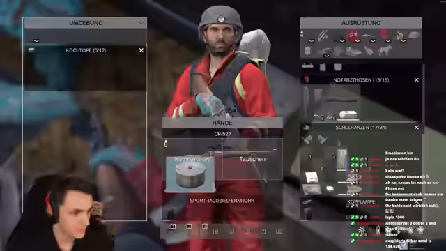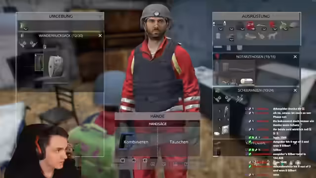 01:56:20Ein Spieler zeigt Symptome einer Cholera-Erkrankung, was sofortige Maßnahmen erfordert. Der andere Spieler sucht gezielt nach Medikamenten wie Cholera-Tabletten und Blutabnahmesets im Krankenhaus. Gleichzeitig wird die Ausrüstung optimiert, wobei Gegenstände wie Gummistiefel und Blutabnahmesets priorisiert werden. Die Kommunikation über Krankheitssymptome und deren Behandlung spielt eine zentrale Rolle.