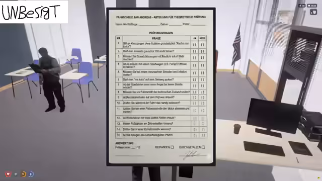 03:15:25Ein Chaos in der Fahrschule sorgt für Turbulenzen während einer Fahrprüfung. Es kommt zu technischen Problemen mit dem Prüfungsauto und dem Prüfling werden grundlegende Verkehrsregeln abgefragt. Die Prüfungsleistung des Kandidaten ist desaströs und er scheitert an fast allen Fragen. Der Prüfer ist überfordert und der Kandidat zeigt sich unkooperativ.