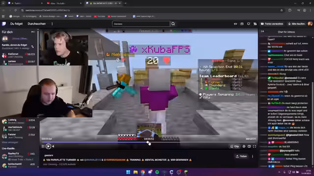 00:09:16Es wird erklärt, warum in den letzten Tagen nicht gestreamt wurde: Ein Besuch bei der Familie in Bayern zum Entspannen. Der Streamer spricht über das verpasste 'Latten-Wichser-Turnier' und erwähnt, dass er Interesse bekundet hatte, aber nicht berücksichtigt wurde. Er äußert sich zum Minecraft-Turnier, insbesondere zum Finale, das er gesehen hat, und wundert sich über den Sieg von Team Sturmwaffel (Philo, Feister und Sturmwaffel). Er analysiert eine Szene aus dem Finale, in der Marcel unglücklich agiert habe und der Ping eine Rolle gespielt haben könnte. Es wird die Frage aufgeworfen, wie Team Sturmwaffel gewinnen konnte, obwohl es bessere deutschsprachige Minecraft-Spieler gab. Der Streamer vermutet, dass Marcel die 10.000 Euro einfach hätte 'aufheben' müssen, da das Team eigentlich sehr stark war. Er rätselt über die Teamzusammensetzung und äußert sich kritisch über die Verteilung der Fähigkeiten innerhalb der Teams.