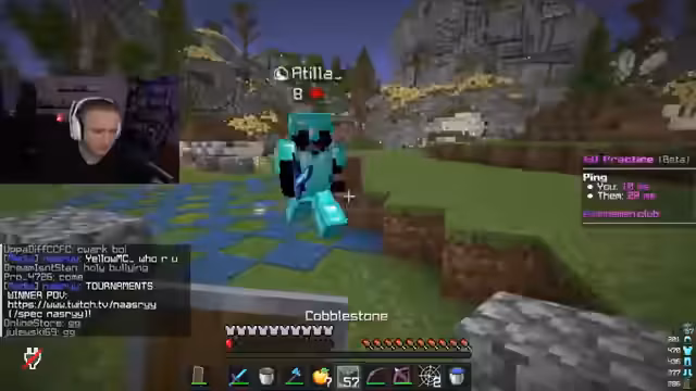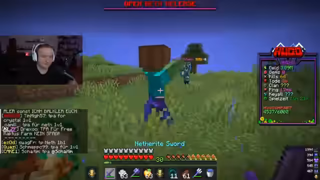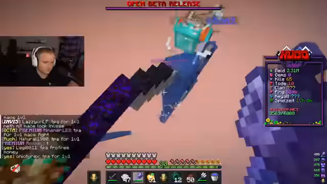 00:52:22Der Stream ist geprägt von intensiven PvP-Kämpfen gegen verschiedene Spieler auf dem Hugo SMP. Der Streamer und seine Partner wie Zoom nutzen TPA (Teleport-Anfragen), um Spieler in Fallen zu locken, und greifen sie mit Waffen wie Tridents, Enderperlen und Maze-Bomben an. Es kommt zu mehrerenSuccessfulen Überfällen, bei denen wertvolle Items wie Crystals gestohlen werden. Der Chat wird für Angriffe und Strategiegespräche genutzt, um Ziele zu identifizieren und anzugreifen.
