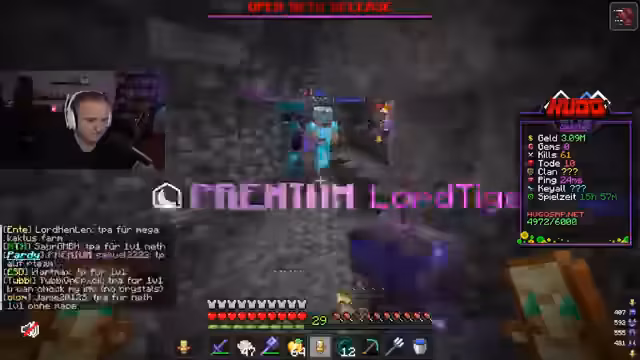 00:09:19Nachdem der Streamer sich im PvP-Modus eines anderen Servers etwas eingearbeitet hat, wechselt er zum Hugo SMP, einem Survival Multiplayer Server. Der Fokus liegt auf dem Sammeln von Crystals und dem Überfallen anderer Spieler. Ein Ziel ist es, reiche Spieler auszurauben, deren Basen aufzudecken und deren Ressourcen zu stehlen. Der Streamer interagiert aktiv mit anderen Spielern und Kooperationspartnern wie Zoom, um seine Strategien umzusetzen.
