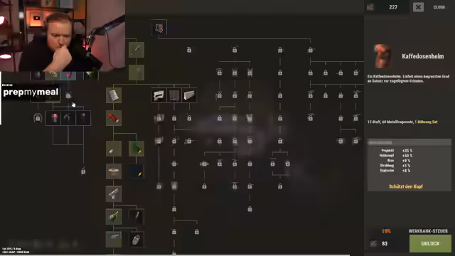 00:08:02Der Streamer konzentriert sich auf die neue Werkbank der Stufe 2. Er testet, welche Waffen und Items damit hergestellt werden können und stellt fest, dass die Metallschrott-Werkbank nun vollständig ausgeschöpft ist. Er baut die neue Werkbank und stellt fest, dass man mit ihr kraftvollere Waffen wie die Thompson craften kann, was ein entscheidender Vorteil gegenüber anderen Teams darstellt.