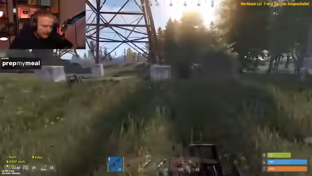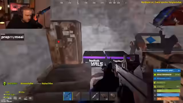 10:47:34Zu Beginn des Streams ist der Streamer auf der Suche nach den restlichen Teammitgliedern. Er fühlt sich von vielen Spielern umgeben und sorgt sich um den Helikopter, fürchtet, dieser könnte geklaut werden. Gemeinsam mit dem aufgetauchten Teammitglied Dominik erkunden sie eine neue Werkbank und stoßen auf feindliche Spieler. Es kommt zu ersten Kämpfen, in denen Gegner eliminiert und eine Waffe sowie ein Rucksack geplündert werden. Das Vorrücken ist vorsichtig, da Gegner erwartet werden.