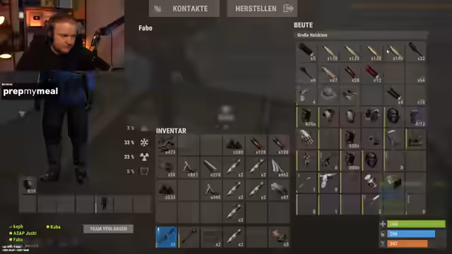 01:27:02Da der Neuzugang Kuba demnächst beitreten soll, bereitet der Streamer eine umfassende Ausrüstung vor. Er craftet für ihn Waffen wie eine Thompson, füllt dessen Inventar mit Munition, Bandagen, Spritzen und Nahrung. Zudem wird ein Werkzeug und ein Rucksack für ihn vorbereitet. Der Streamer zeigt sich bemüht, Kuba direkt nach seinem Eintreffen vollständig ausgestattet in das Spiel zu integrieren.