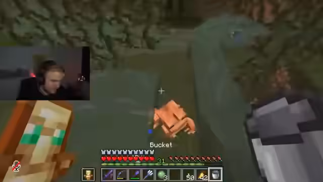 00:42:36Nachdem der Körper des Eisengolems fertiggestellt war, zeigte sich der Streamer begeistert von dem Ergebnis und prophezeite, dass es krass aussehen würde, sobald auch Kopf und Armen angefügt würden. Anschließend wollte er dem Streamer eine illegale Sache in Minecraft zeigen, welche sich jedoch als ein Bug herausstellte, bei dem ein geworfener Schnee block brennt, obwohl Schnee normalerweise nicht brennbar ist. Er bezeichnete dies fälschlicherweise als illegal.