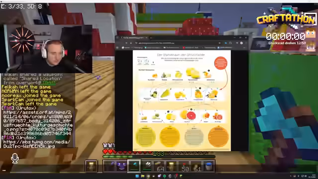 02:28:00Auf der Suche nach Aktionen im Spiel überlegt der Streamer, eine neue Bank zu bauen, da die alte ihm nicht gefällt. Er farmt dafür Materialien wie Quarz. Parallel dazu finden ausführliche, aber scheinbar oberflächliche Gespräche über die Botanik von Zitrusfrüchten statt. Er diskutiert die Herkunft von Orangen, Grapefruits und anderen Früchten, verwirrt sich aber dabei und stellt seine bisherigen Annahmen infrage.