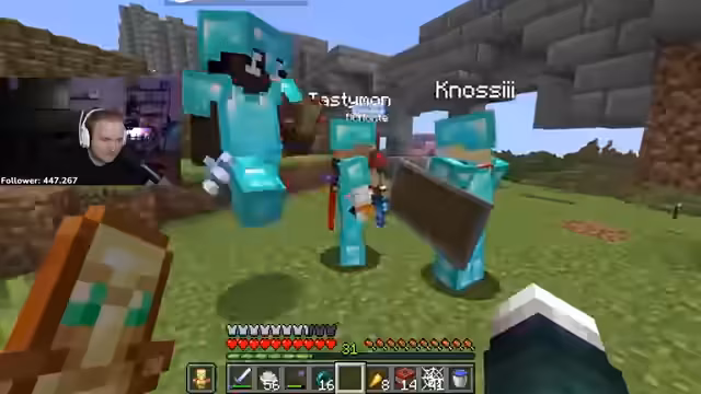 03:19:14In der Frühphase des Streams planen die Teilnehmer die Verteidigung ihres Territoriums. Sie diskutieren den Bau eines Wasseraufzugs zu den Villagern, entscheiden sich aber letztlich gegen eine verzögerte Verteidigungsstrategie aufgrund von Zeitmangel und unzureichender Ausrüstung mit Netherite-Rüstung. Trotz der Befürchtung, überfordert zu sein ("Wir greifen jetzt an, werden wir wahrscheinlich gefickt"), starten sie einen direkten Angriff, während sie Ressourcen wie Schneebälle sammeln und strategische Positionen besetzen. Ein zentraler Fokus liegt auf der Sicherung von Nahrung und Materialien wie Wolle, Leder und Glas, wobei sie ihre eigene Situation als "Penner" kritisieren.