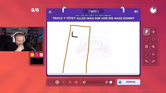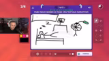 02:57:21Die erste Gartic Phone Runde beginnt. Ein Teilnehmer muss Hugo auf einem Skateboard mit einer Gönnergy zeichnen. Die anderen interpretieren die Zeichnung unterschiedlich, erkennen aber den skatenden Schmobbin. Es gibt viel Gelächter und Verwirrung über die Darstellungen. In der nächsten Runde soll Hugo weinend gezeichnet werden, was zu lustigen Interpretationen führt.
