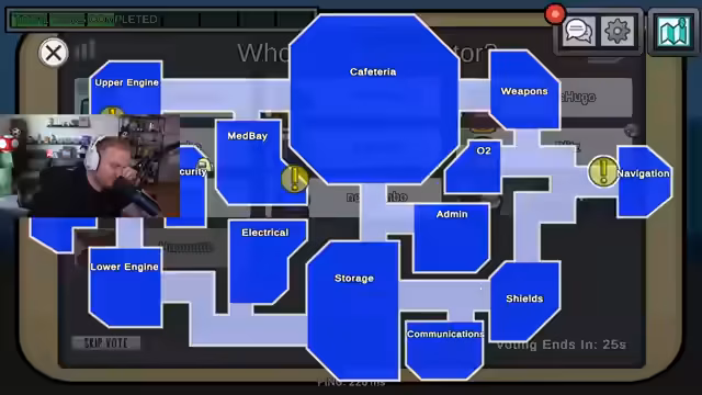 00:20:36Nach diversen technischen Vorbereitungen beginnt das Among Us-Spiel. Die Runde startet mit Emote Only für Crewmates und ohne Mitsprache des Chats. Es werden verdächtige Aktivitäten beobachtet, als Hugo als Impostor vermutet wird, nachdem eine Leiche in Lower Engine gefunden wurde. Die Spieler beginnen, über mögliche Täter zu diskutieren und observieren gegenseitig ihre Bewegungen auf der Karte.