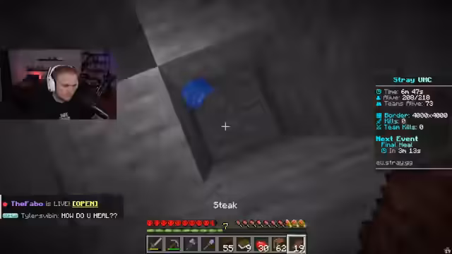 03:13:18Nach einem Basisangriff auf eine zuvor gezeigte Base wird die Situation mit Gambo besprochen. Es folgt eine intensive Diskussion über die Regeln für ein geplantes 1v1, einschließlich der erlaubten Items (Maze, Wind Charges, Ender Pearls) und der Anzahl der Totems (Pops). Zeitlich knapp vor dem UHC-Event wird versucht, die Konditionen für den Kampf final abzustimmen.